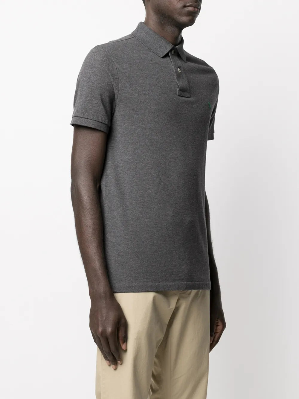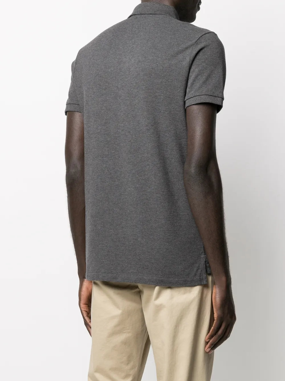 Gola polo de algodão cinza escuro, estampa Polo Pony, botões frontais, carcela, mangas curtas, bainha reta