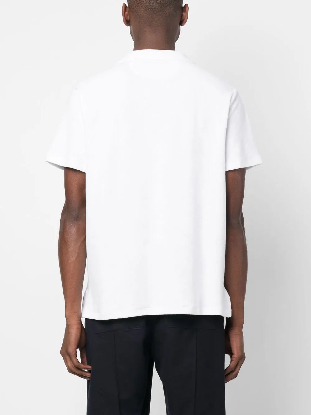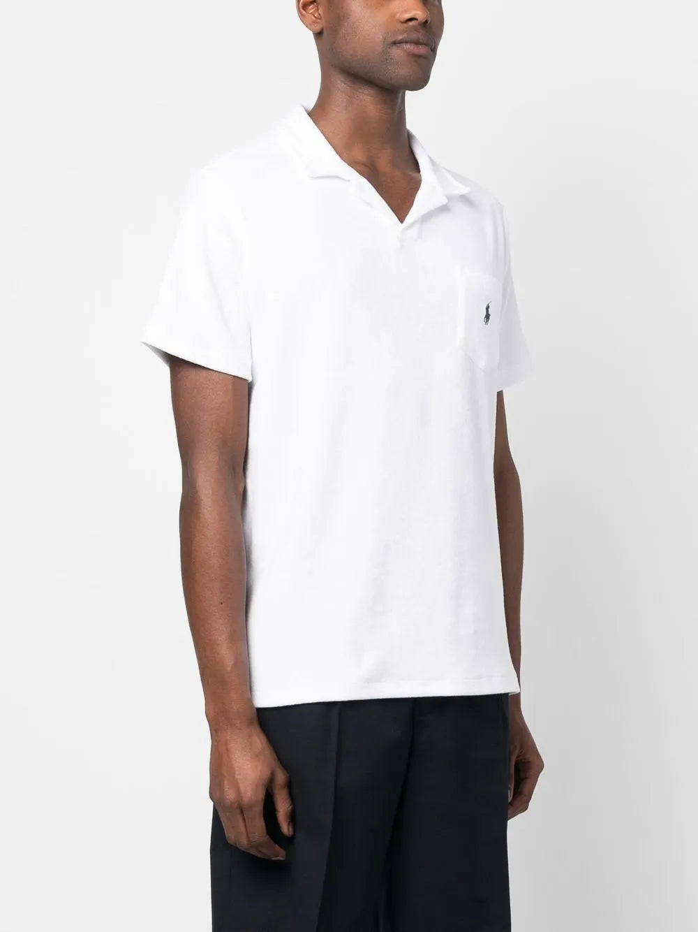 mistura de algodão branco, gola entalhada, assinatura Polo Pony, bolso aplicado no peito, mangas curtas, bainha reta