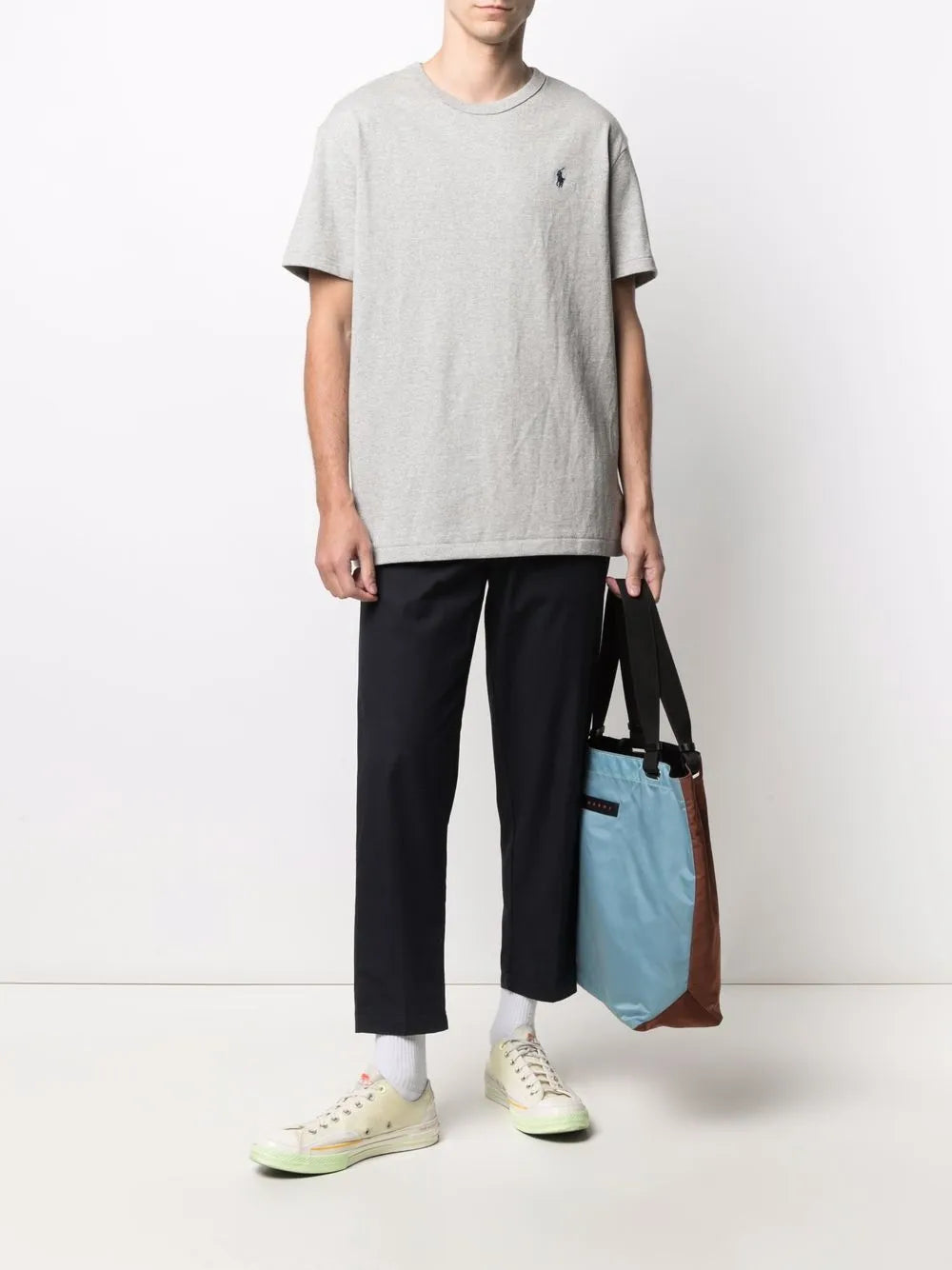 logotipo bordado de algodão cinza, gola redonda, mangas curtas, bainha reta