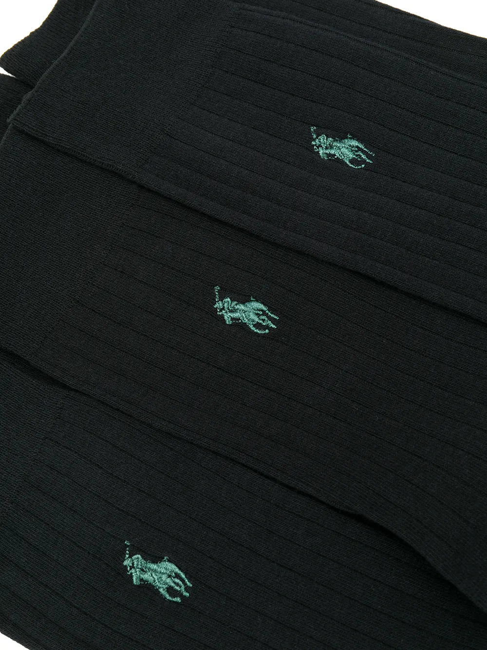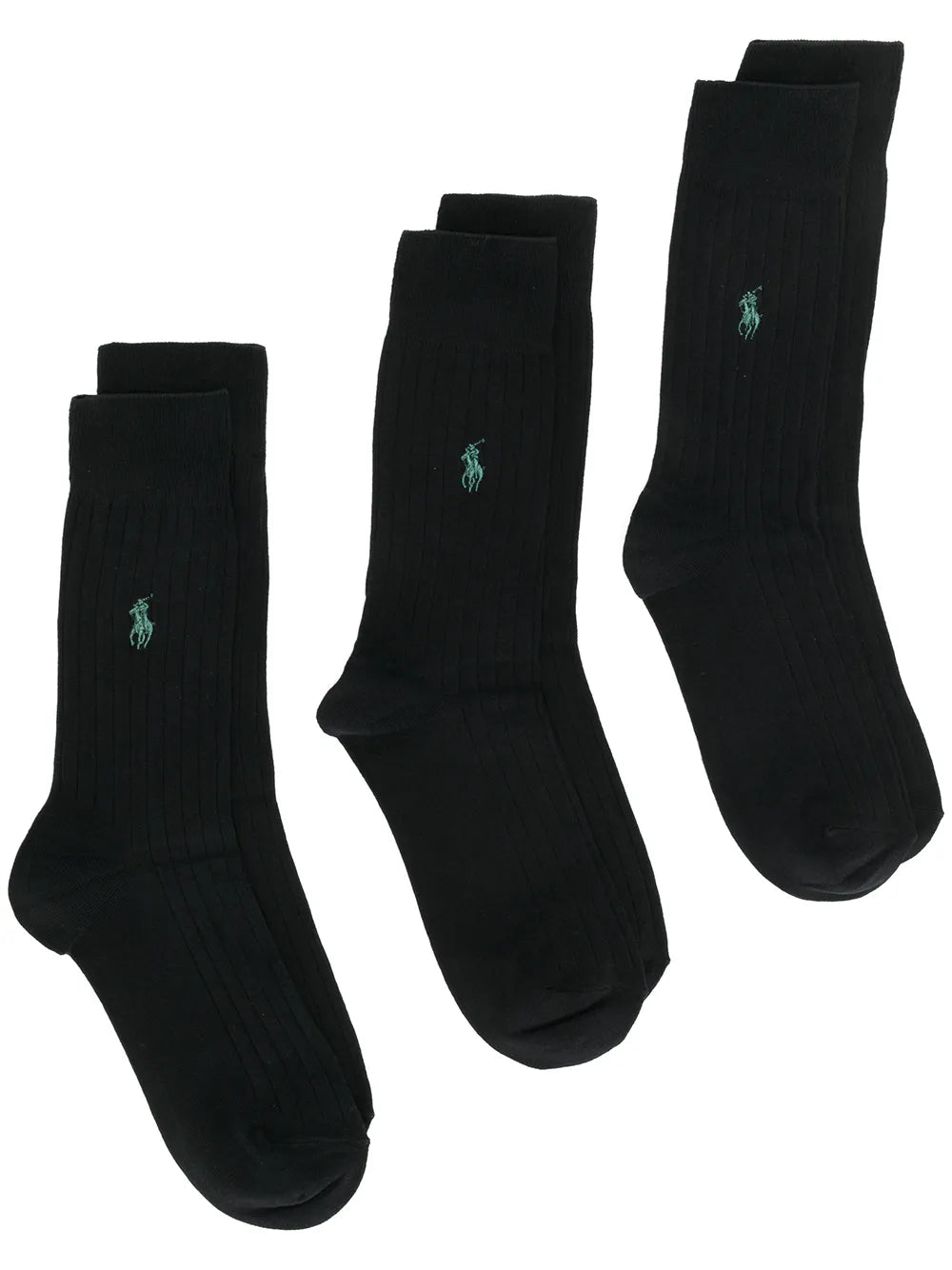 Conjunto de três meias Polo Ralph Lauren em mistura de algodão preto, com abertura canelada e logotipo Pony bordado exclusivo. Observe que os tamanhos 39-42 = tamanho P e 42-46 = tamanho M. Meias e meias-calças devem ser devolvidas na embalagem original fechada.