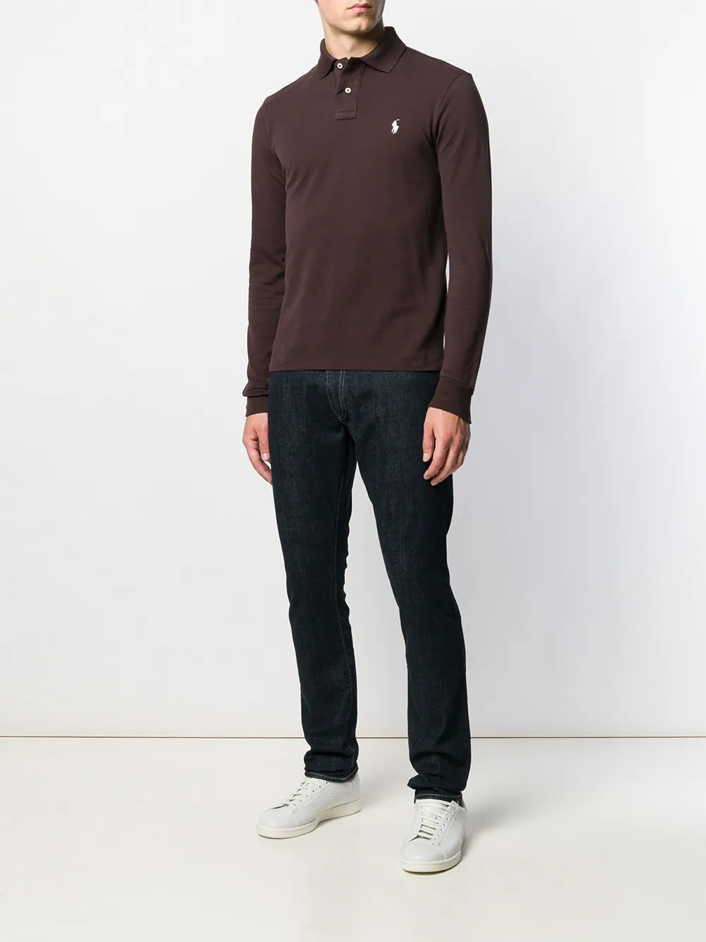 Calça jeans reta de algodão azul-escuro da Polo Ralph Lauren, com cós com passantes para cinto, braguilha com botão e zíper, perna reta, comprimento regular e cinco bolsos.