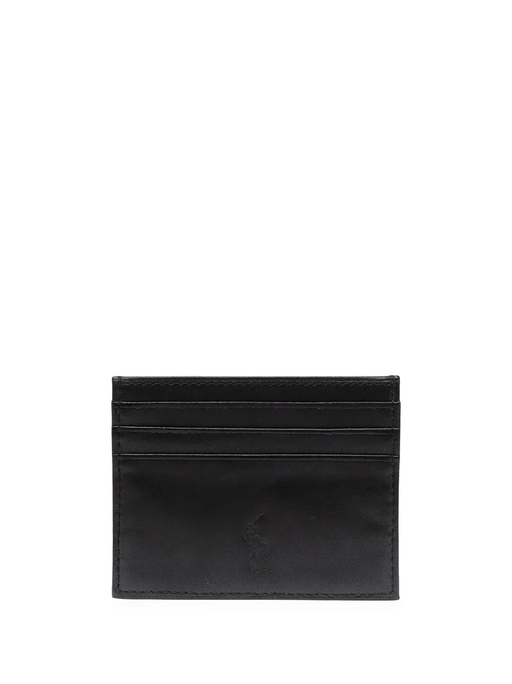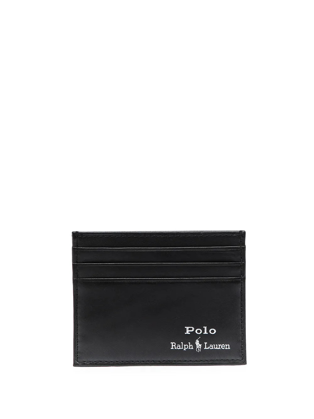 couro preto/prata, logotipo prateado, letras, assinatura, motivo Polo Pony, compartimentos para cartões, compartimento interno para notas